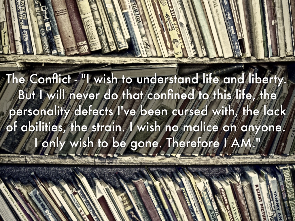 The Conflict - "I wish to understand life and liberty. But I will never do that confined to this life, the personality defects I've been cursed with, the lack of abilities, the strain. I wish no malice on anyone. I only wish to be gone. Therefore I AM."