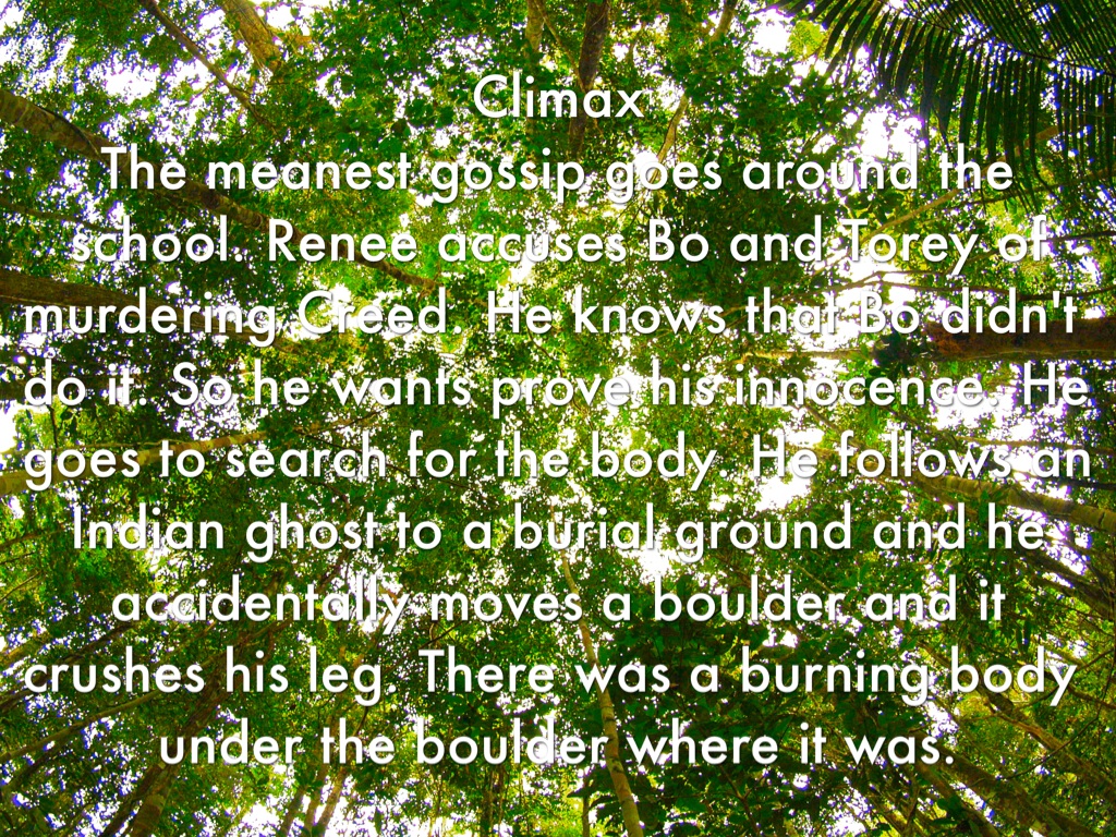 Climax The meanest gossip goes around the school. Renee accuses Bo and Torey of murdering Creed. He knows that Bo didn't do it. So he wants prove his innocence. He goes to search for the body. He follows an Indian ghost to a burial ground and he accidentally moves a boulder and it crushes his leg. There was a burning body under the boulder where it was.