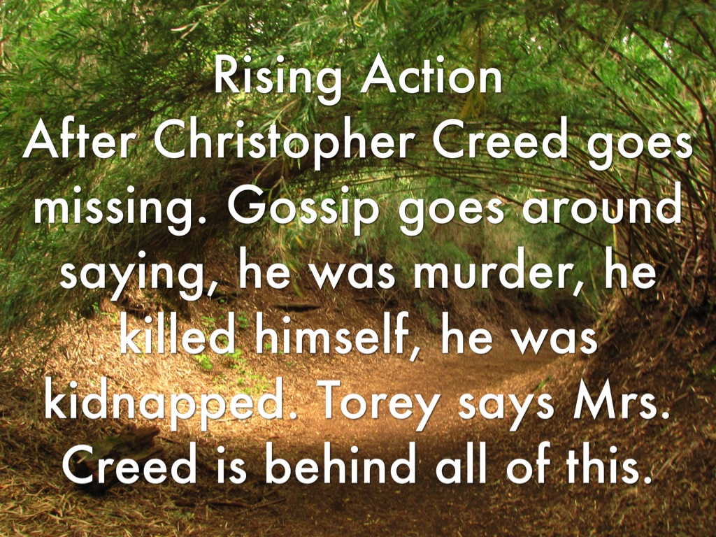 Rising Action After Christopher Creed goes missing. Gossip goes around saying, he was murder, he killed himself, he was kidnapped. Torey says Mrs. Creed is behind all of this.