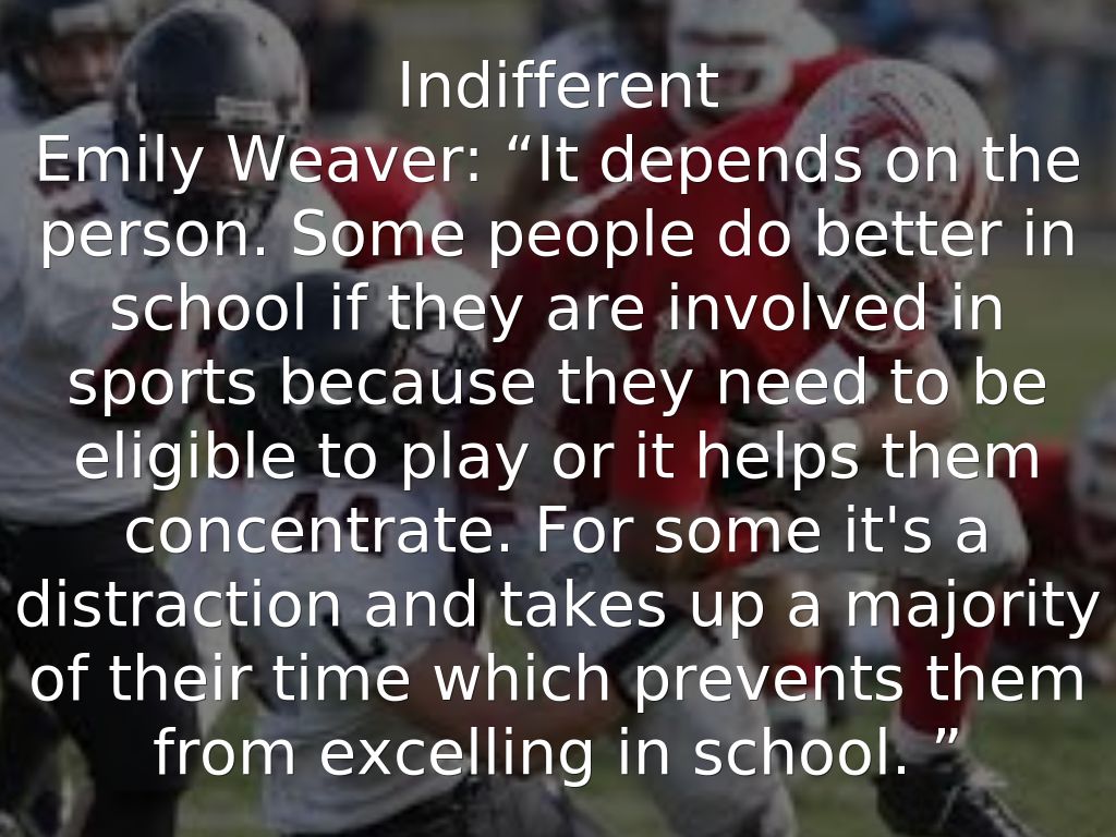 Emily Weaver: “It depends on the person. Some people do better in school if they are involved in sports because they need to be eligible to play or it helps them concentrate. For some it's a distraction and takes up a majority of their time which prevents them from excelling in school. ”