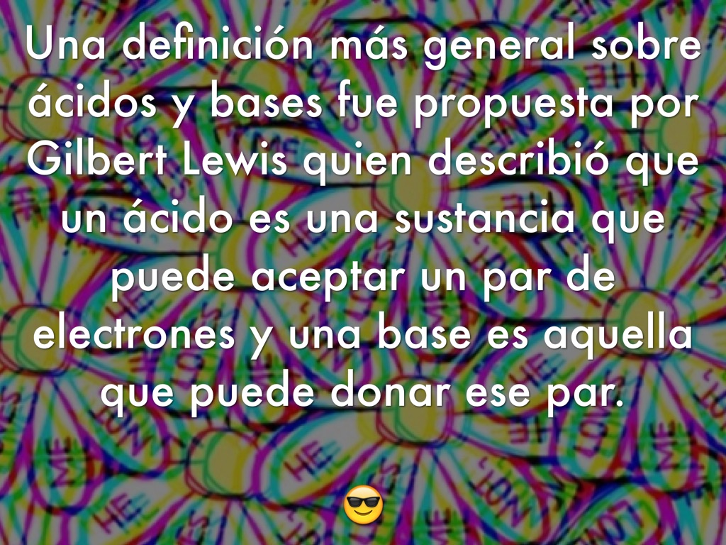 Una definición más general sobre ácidos y bases fue propuesta por Gilbert Lewis quien describió que un ácido es una sustancia que puede aceptar un par de electrones y una base es aquella que puede donar ese par.