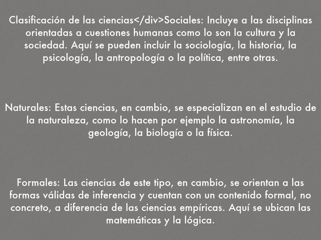 Clasificación de las cienciasSociales: Incluye a las disciplinas orientadas a cuestiones humanas como lo son la cultura y la sociedad. Aquí se pueden incluir la sociología, la historia, la psicología, la antropología o la política, entre otras.