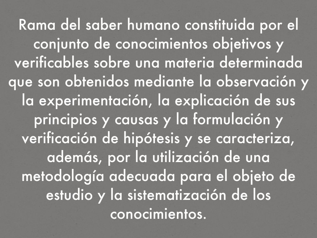 Rama del saber humano constituida por el conjunto de conocimientos objetivos y verificables sobre una materia determinada que son obtenidos mediante la observación y la experimentación, la explicación de sus principios y causas y la formulación y verificación de hipótesis y se caracteriza, además, por la utilización de una metodología adecuada para el objeto de estudio y la sistematización de los conocimientos.
