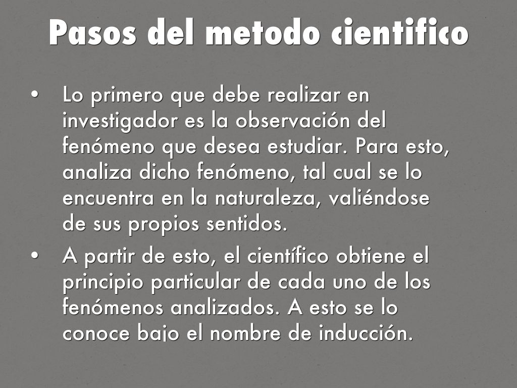 - A partir de esto, el científico obtiene el principio particular de cada uno de los fenómenos analizados. A esto se lo conoce bajo el nombre de inducción.
