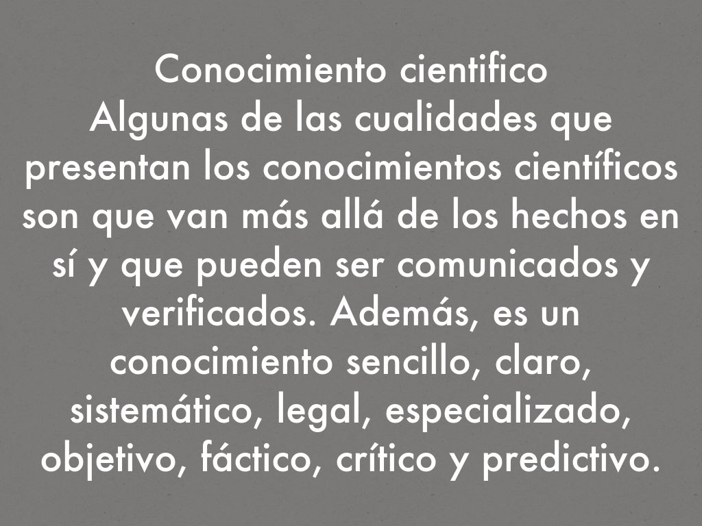 Algunas de las cualidades que presentan los conocimientos científicos son que van más allá de los hechos en sí y que pueden ser comunicados y verificados. Además, es un conocimiento sencillo, claro, sistemático, legal, especializado, objetivo, fáctico, crítico y predictivo.