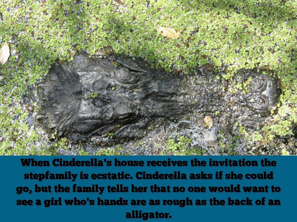 When Cinderella's house receives the invitation the stepfamily is ecstatic. Cinderella asks if she could go, but the family tells her that no one would want to see a girl who's hands are as rough as the back of an alligator.