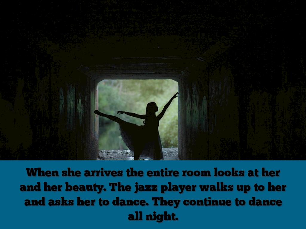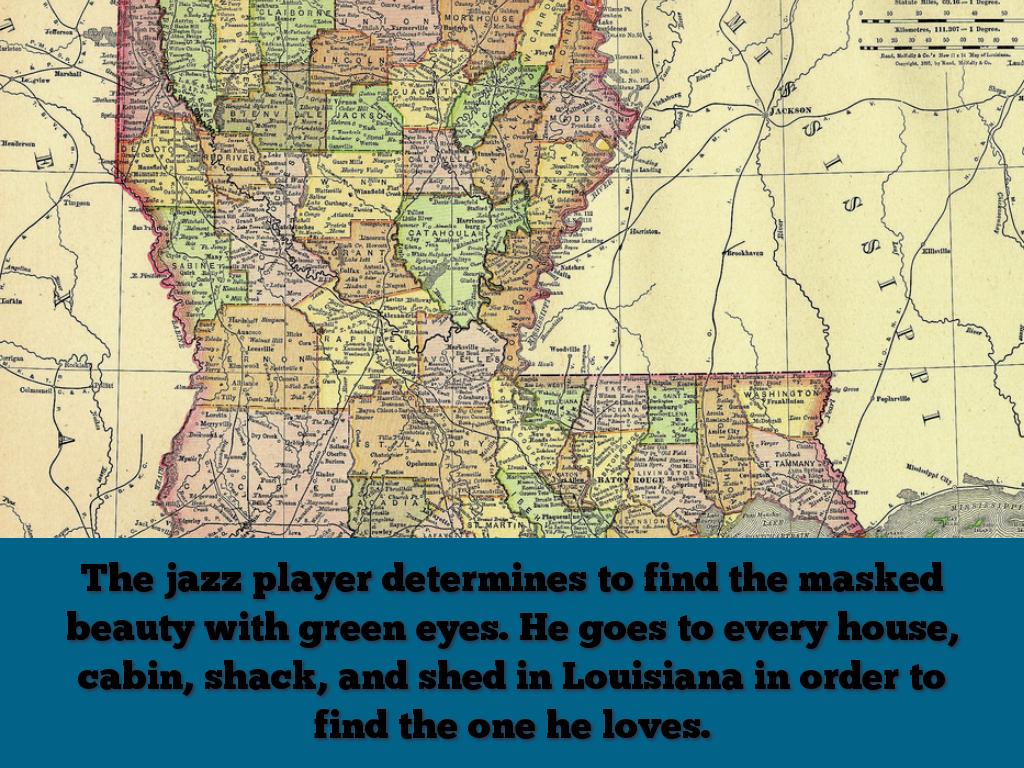 The jazz player determines to find the masked beauty with green eyes. He goes to every house, cabin, shack, and shed in Louisiana in order to find the one he loves.