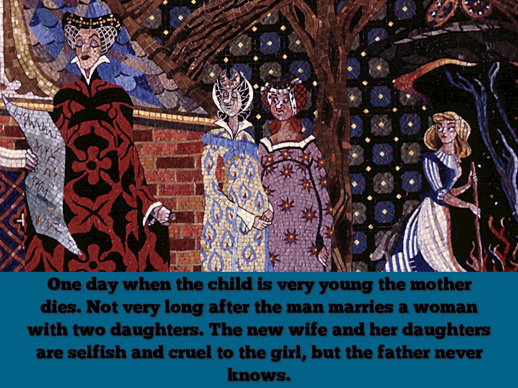 One day when the child is very young the mother dies. Not very long after the man marries a woman with two daughters. The new wife and her daughters are selfish and cruel to the girl, but the father never knows.