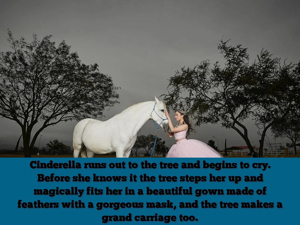 Cinderella runs out to the tree and begins to cry. Before she knows it the tree steps her up and magically fits her in a beautiful gown made of feathers with a gorgeous mask, and the tree makes a grand carriage too.
