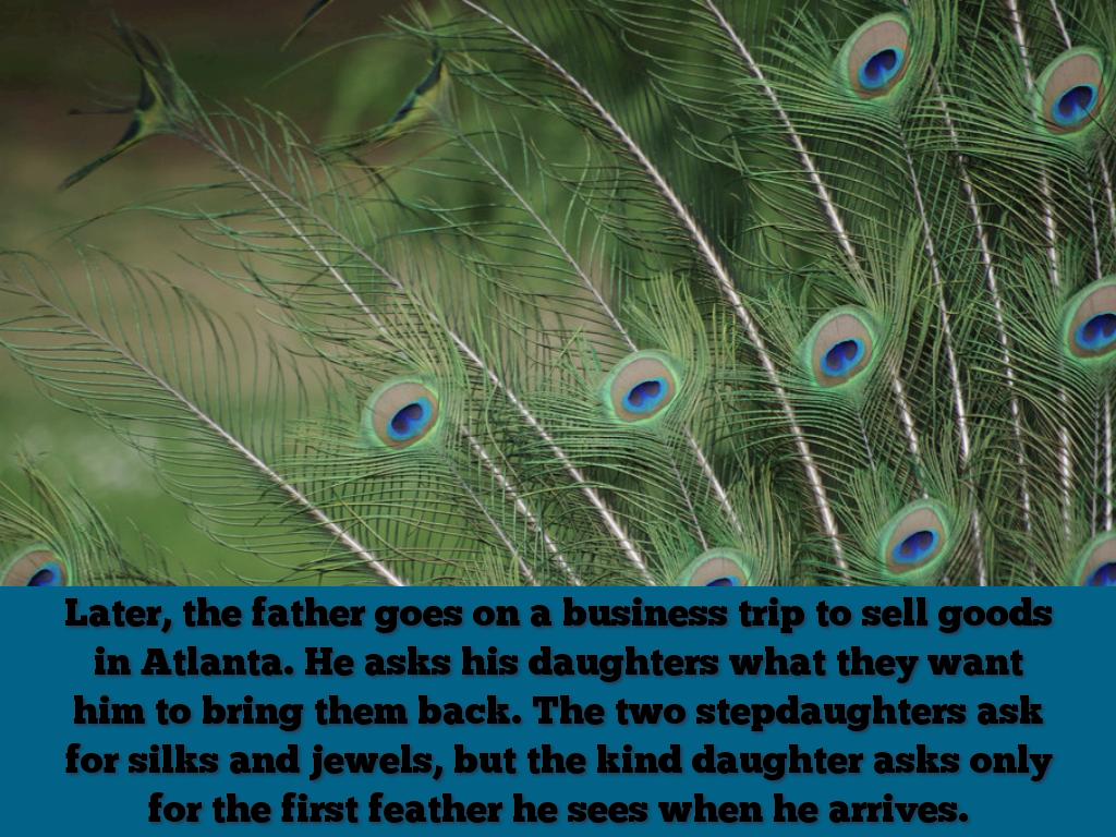 Later, the father goes on a business trip to sell goods in Atlanta. He asks his daughters what they want him to bring them back. The two stepdaughters ask for silks and jewels, but the kind daughter asks only for the first feather he sees when he arrives.