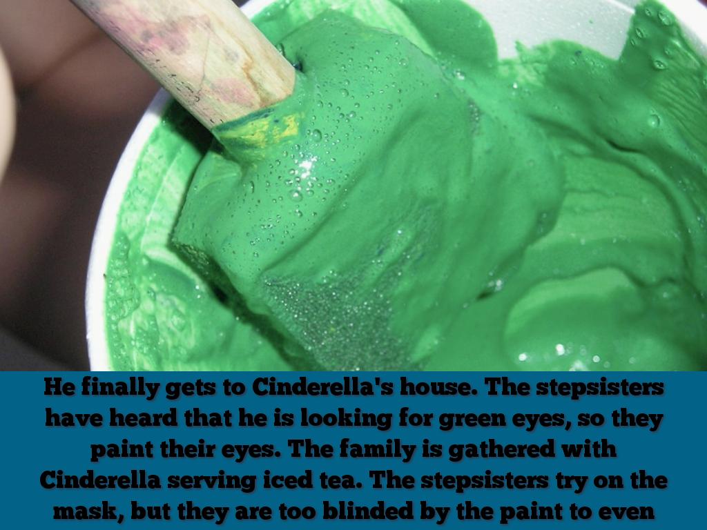 He finally gets to Cinderella's house. The stepsisters have heard that he is looking for green eyes, so they paint their eyes. The family is gathered with Cinderella serving iced tea. The stepsisters try on the mask, but they are too blinded by the paint to even open their eyes.