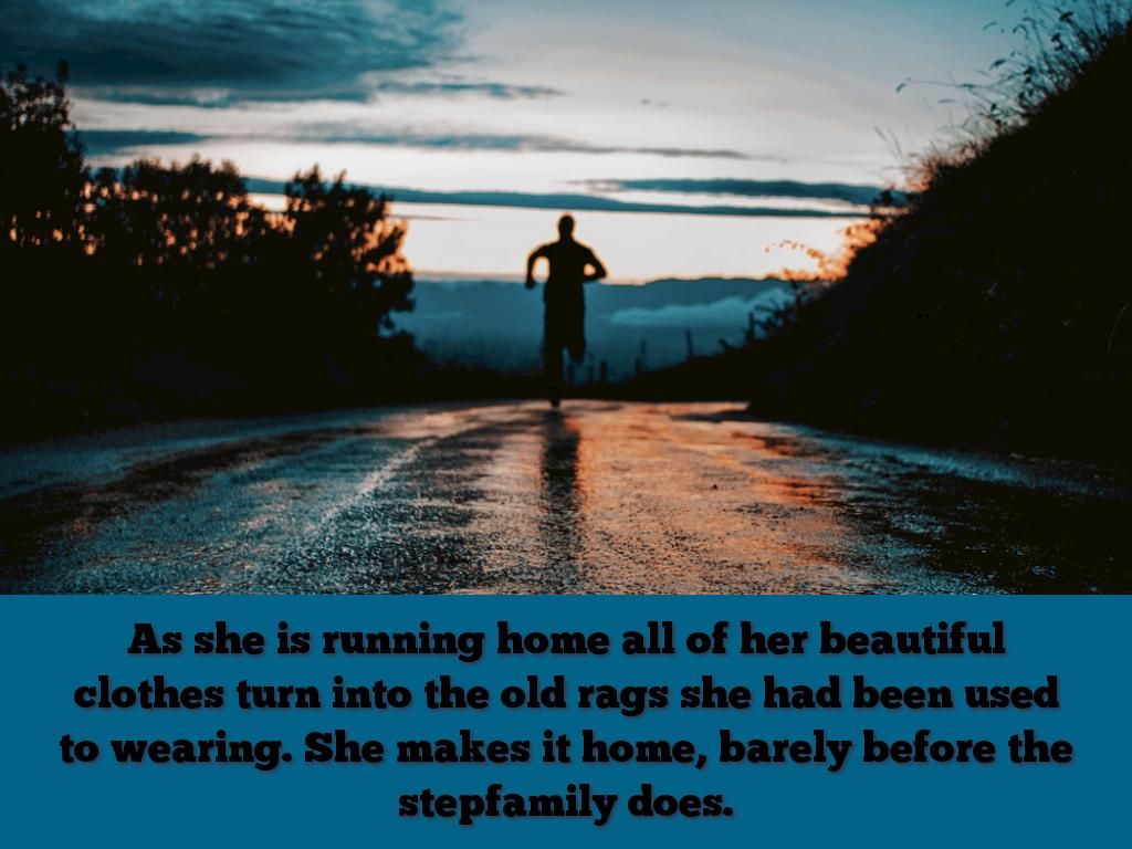 As she is running home all of her beautiful clothes turn into the old rags she had been used to wearing. She makes it home, barely before the stepfamily does.