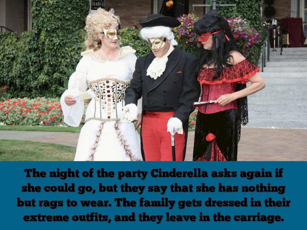 The night of the party Cinderella asks again if she could go, but they say that she has nothing but rags to wear. The family gets dressed in their extreme outfits, and they leave in the carriage.