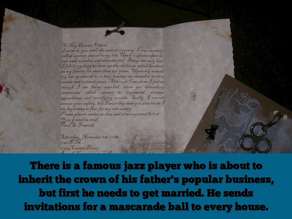 There is a famous jazz player who is about to inherit the crown of his father's popular business, but first he needs to get married. He sends invitations for a mascarade ball to every house.