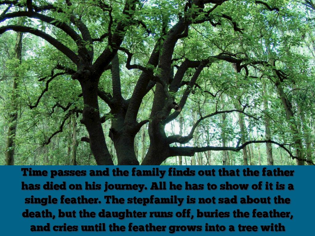 Time passes and the family finds out that the father has died on his journey. All he has to show of it is a single feather. The stepfamily is not sad about the death, but the daughter runs off, buries the feather, and cries until the feather grows into a tree with feathers for leaves
