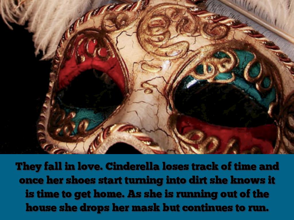 They fall in love. Cinderella loses track of time and once her shoes start turning into dirt she knows it is time to get home. As she is running out of the house she drops her mask but continues to run.