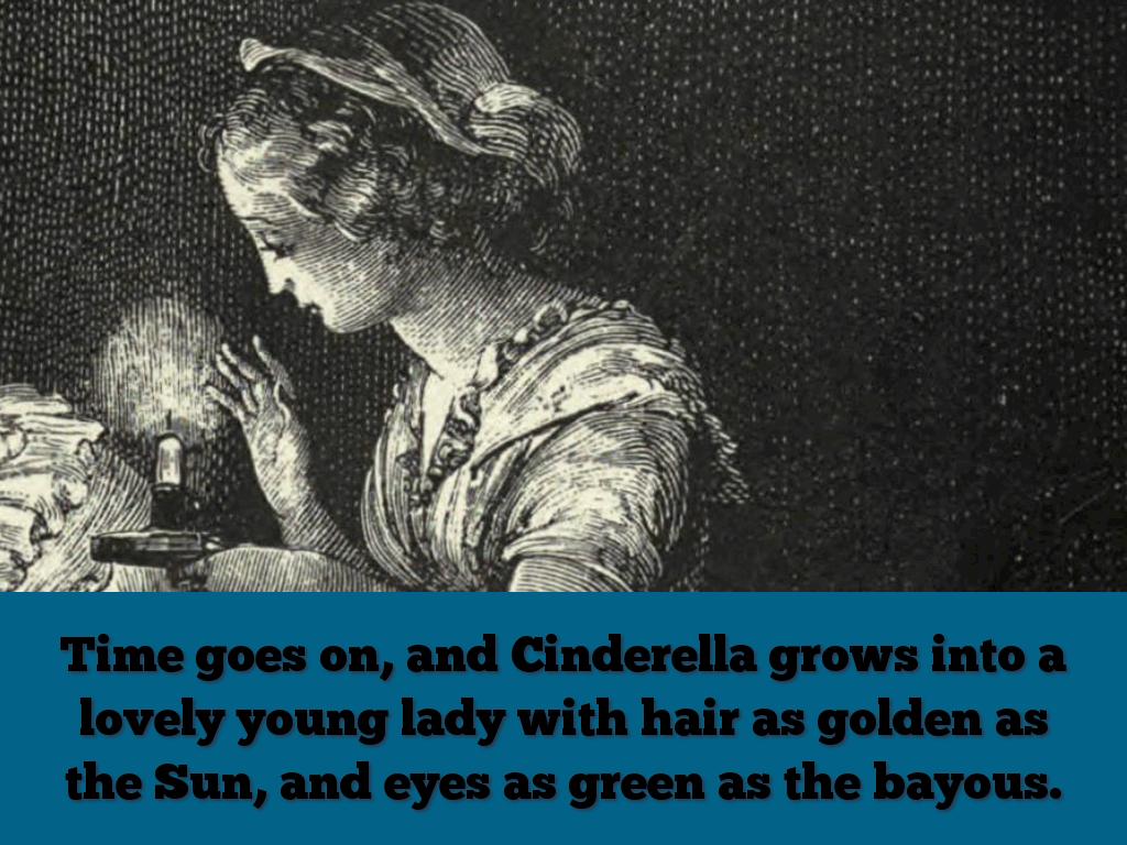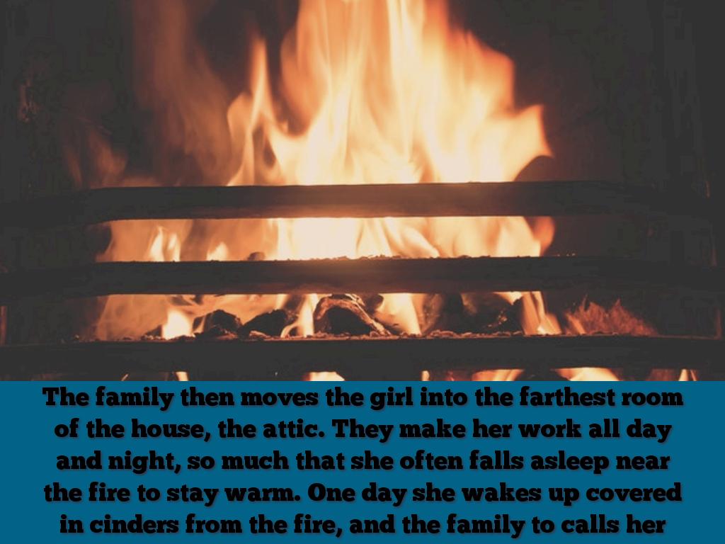 The family then moves the girl into the farthest room of the house, the attic. They make her work all day and night, so much that she often falls asleep near the fire to stay warm. One day she wakes up covered in cinders from the fire, and the family to calls her "Cinderella."