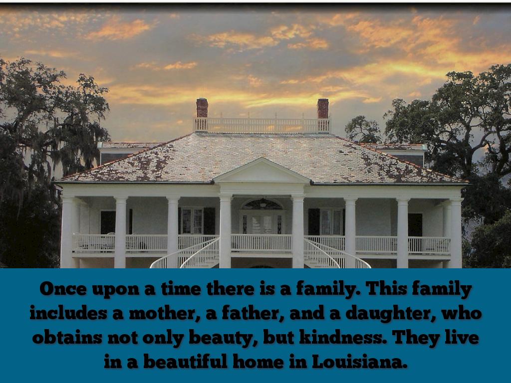 Once upon a time there is a family. This family includes a mother, a father, and a daughter, who obtains not only beauty, but kindness. They live in a beautiful home in Louisiana.