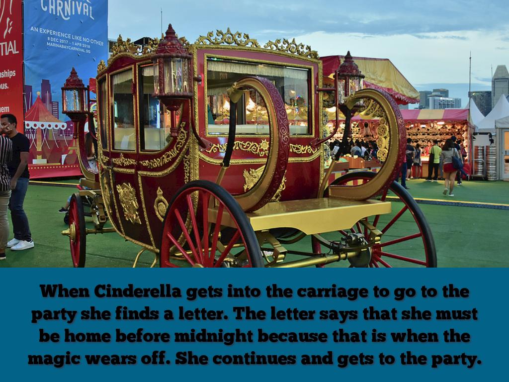 When Cinderella gets into the carriage to go to the party she finds a letter. The letter says that she must be home before midnight because that is when the magic wears off. She continues and gets to the party.