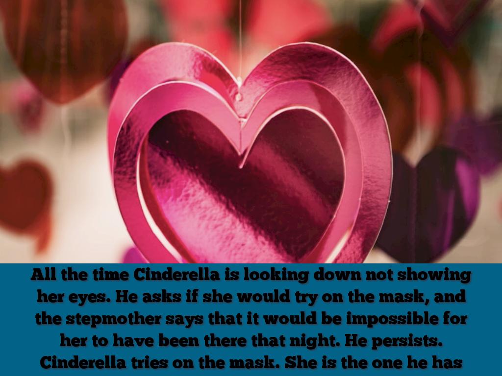 All the time Cinderella is looking down not showing her eyes. He asks if she would try on the mask, and the stepmother says that it would be impossible for her to have been there that night. He persists. Cinderella tries on the mask. She is the one he has been looking for.