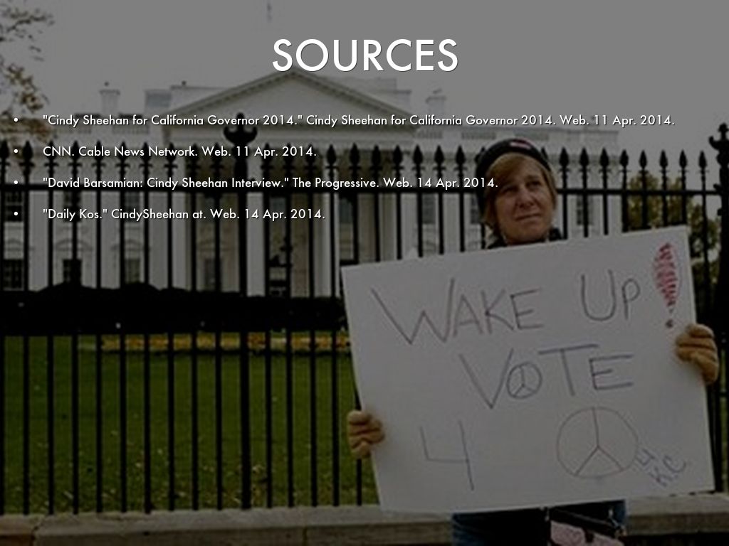 "Cindy Sheehan for California Governor 2014." Cindy Sheehan for California Governor 2014. Web. 11 Apr. 2014.