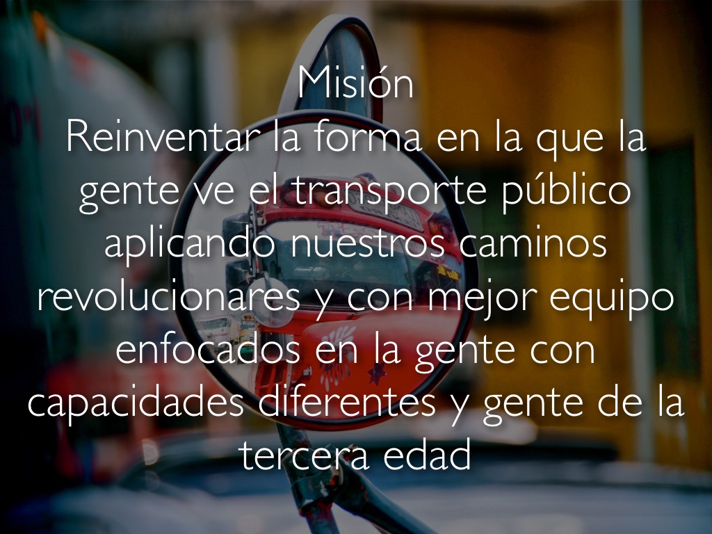 Reinventar la forma en la que la gente ve el transporte público aplicando nuestros caminos revolucionares y con mejor equipo enfocados en la gente con capacidades diferentes y gente de la tercera edad