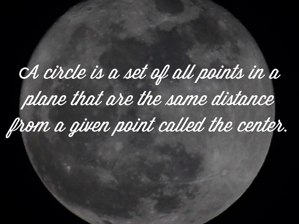 A circle is a set of all points in a plane that are the same distance from a given point called the center.
