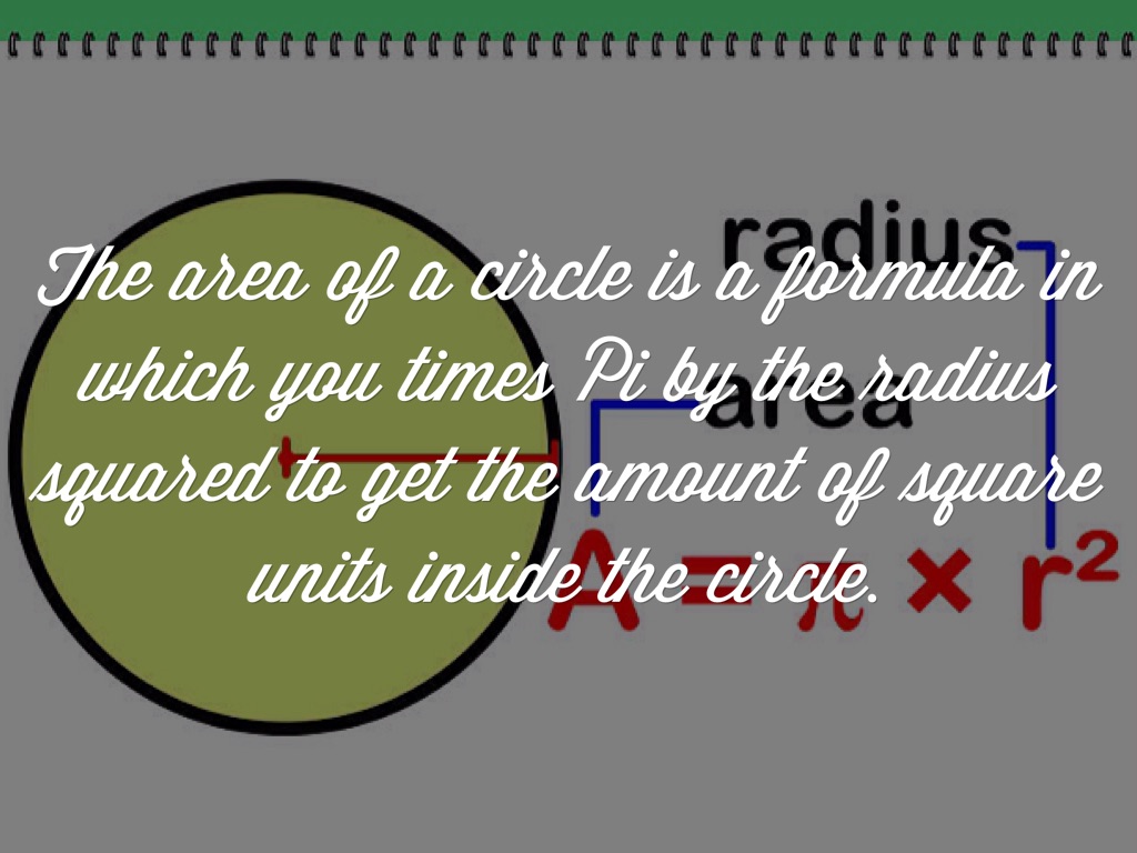 The area of a circle is a formula in which you times Pi by the radius squared to get the amount of square units inside the circle.