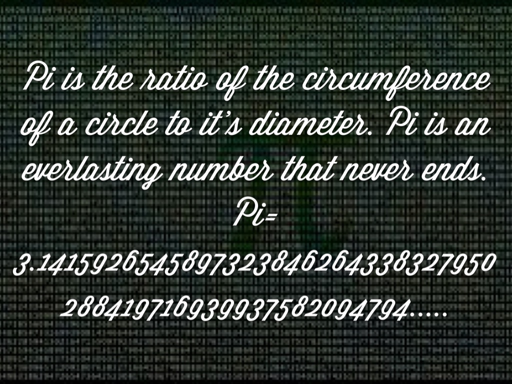 Pi is the ratio of the circumference of a circle to it's diameter. Pi is an everlasting number that never ends. Pi= 3.1415926545897323846264338327950288419716939937582094794.....