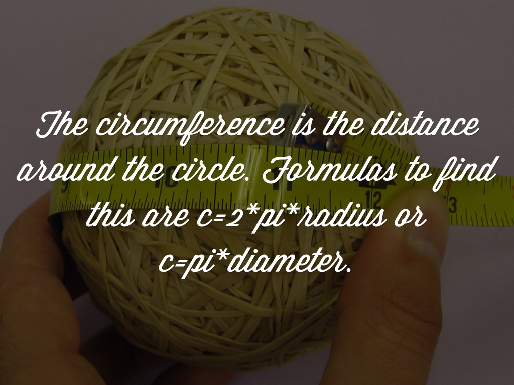 The circumference is the distance around the circle. Formulas to find this are c=2*pi*radius or c=pi*diameter.
