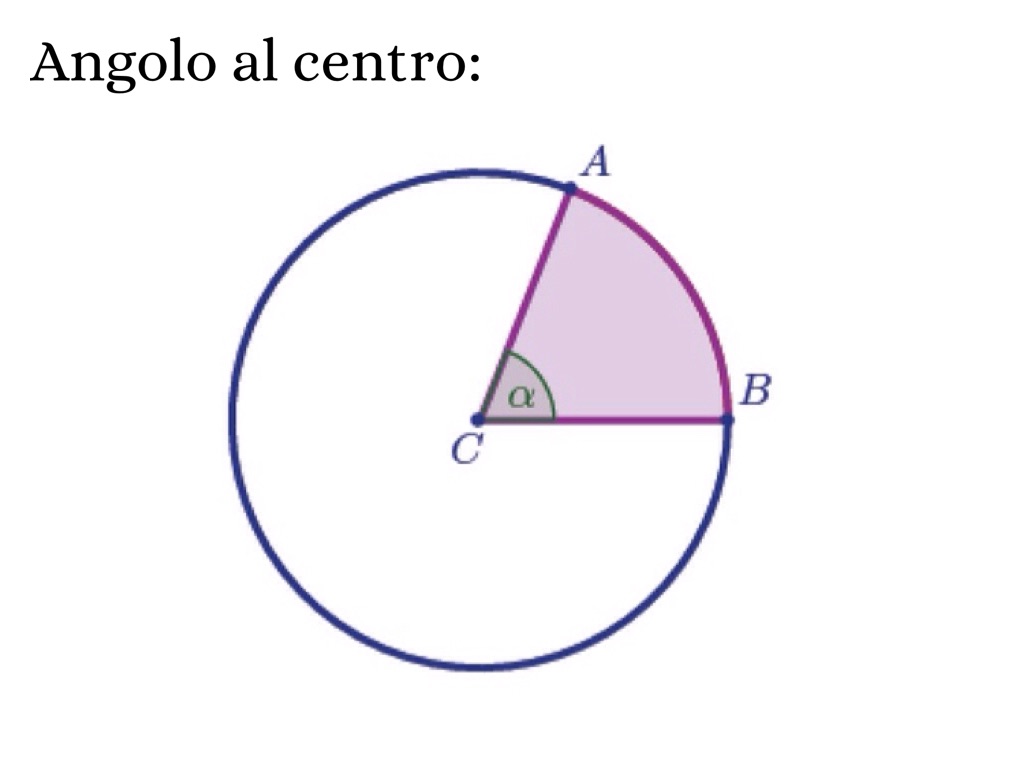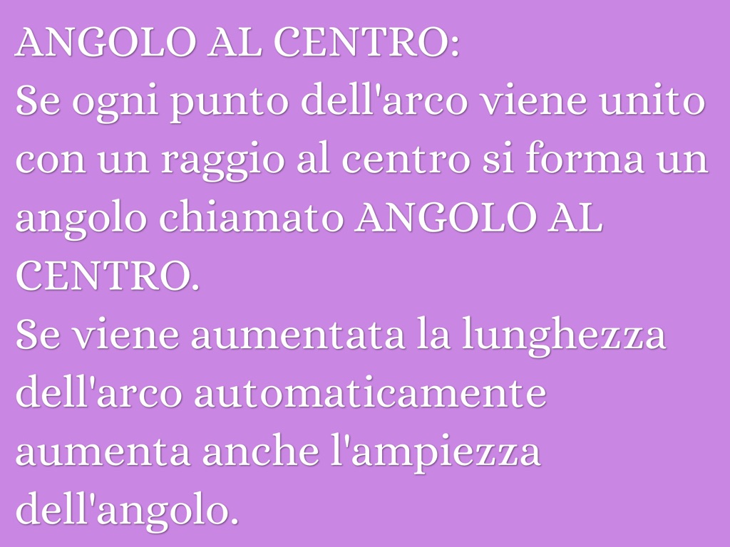 Se ogni punto dell'arco viene unito con un raggio al centro si forma un angolo chiamato ANGOLO AL CENTRO.