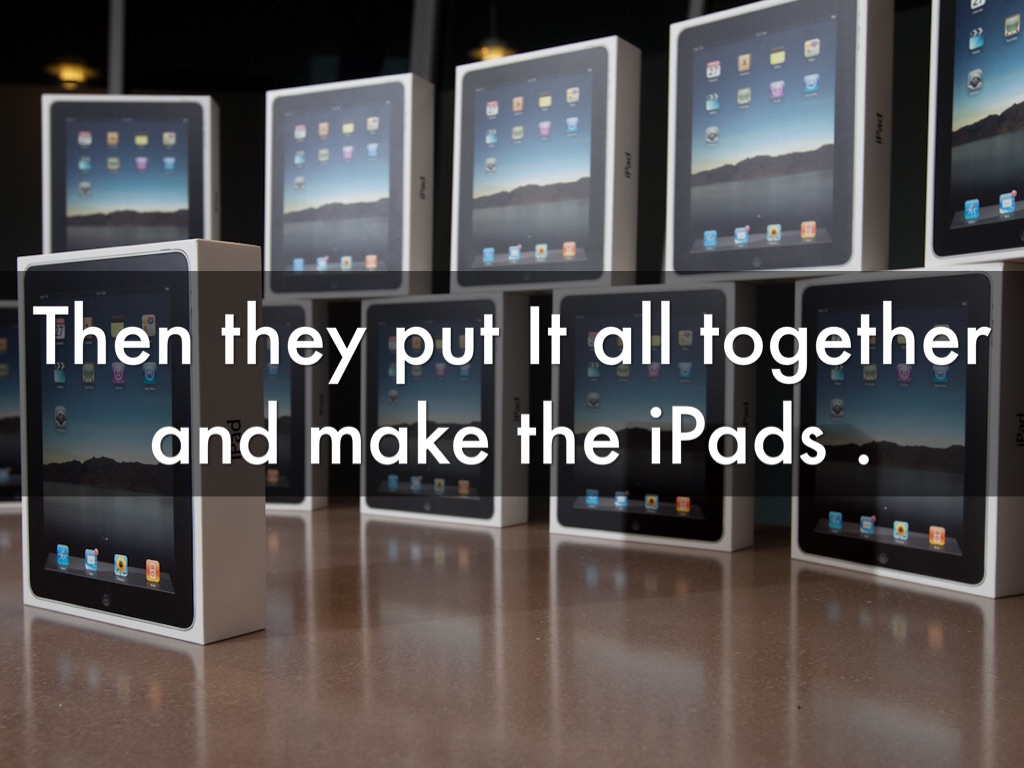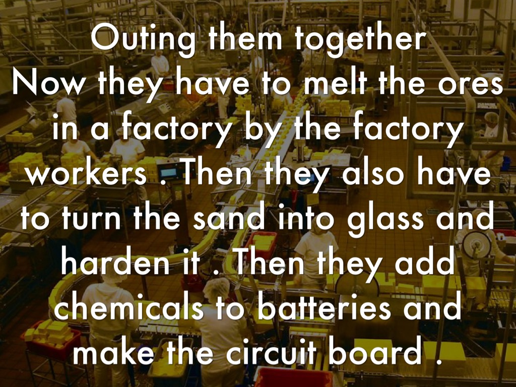 Outing them together Now they have to melt the ores in a factory by the factory workers . Then they also have to turn the sand into glass and harden it . Then they add chemicals to batteries and make the circuit board .