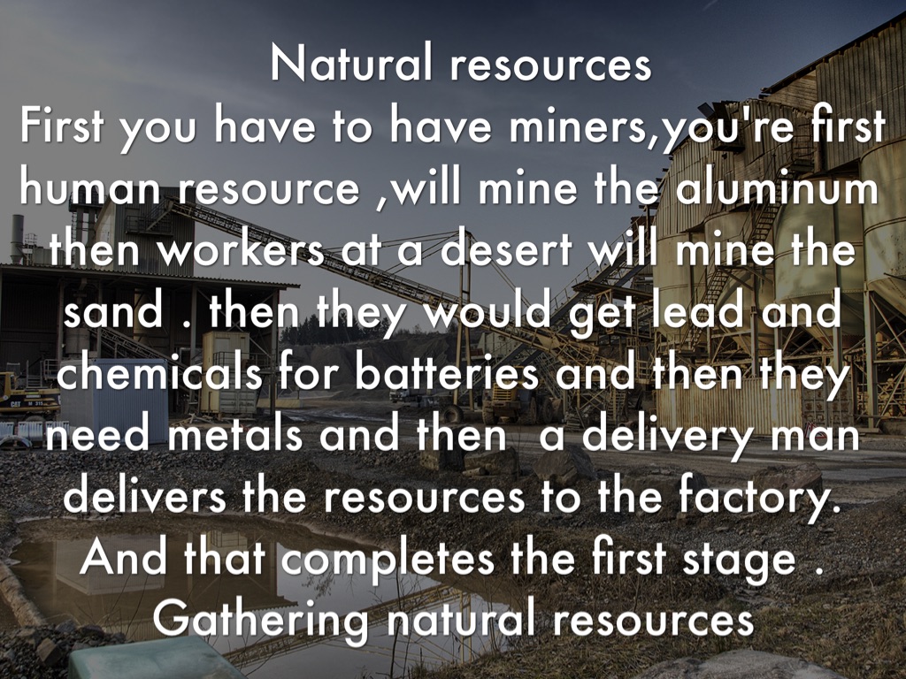 Natural resources First you have to have miners,you're first human resource ,will mine the aluminum then workers at a desert will mine the sand . then they would get lead and chemicals for batteries and then they need metals and then a delivery man delivers the resources to the factory. And that completes the first stage . Gathering natural resources