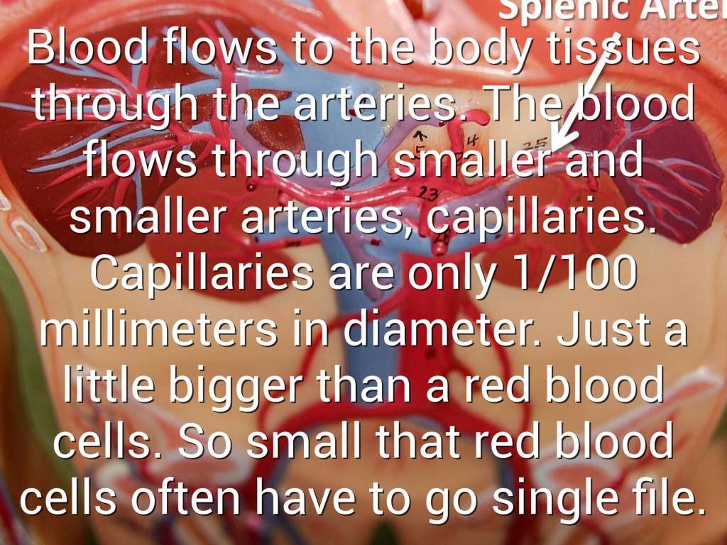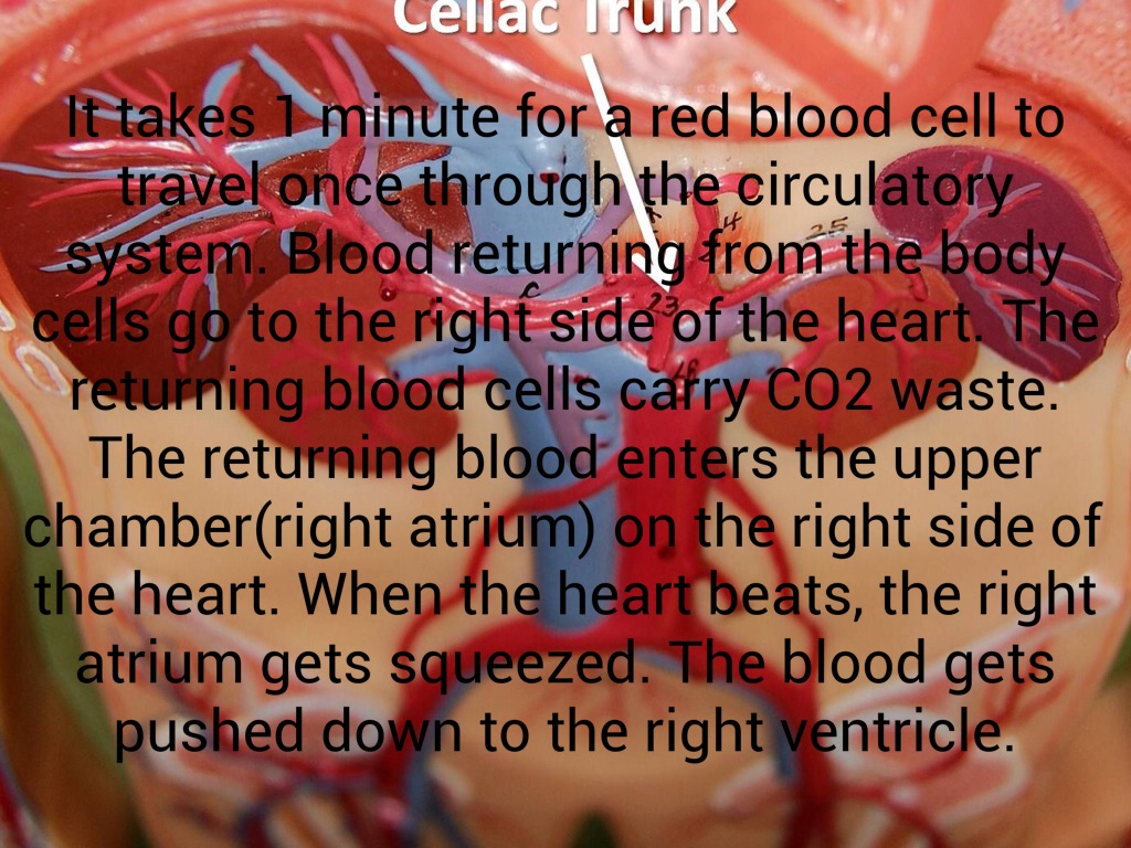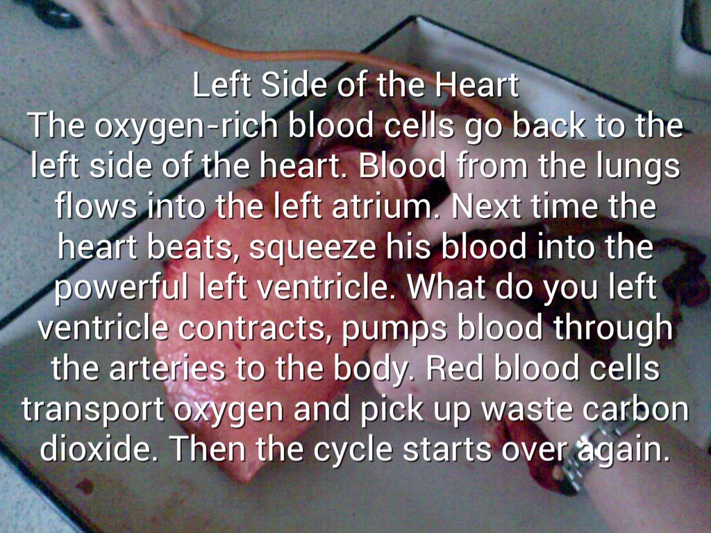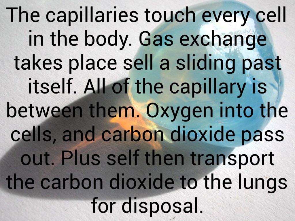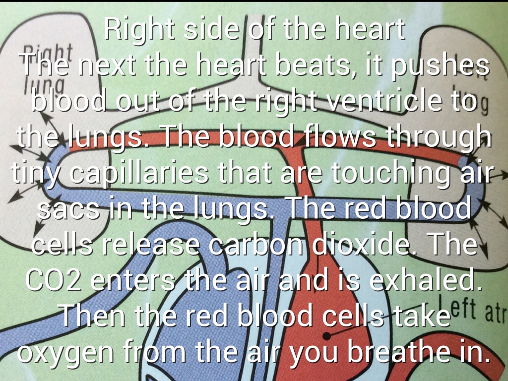 The next the heart beats, it pushes blood out of the right ventricle to the lungs. The blood flows through tiny capillaries that are touching air sacs in the lungs. The red blood cells release carbon dioxide. The CO2 enters the air and is exhaled. Then the red blood cells take oxygen from the air you breathe in.