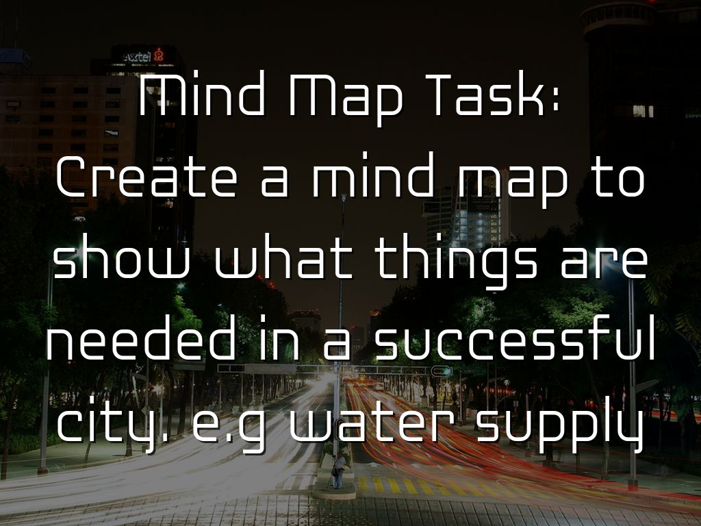 Create a mind map to show what things are needed in a successful city. e.g water supply