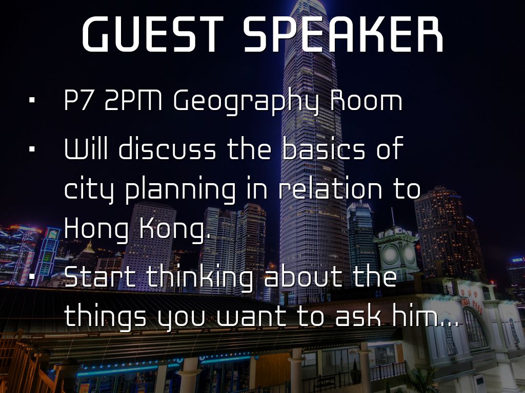 • Will discuss the basics of city planning in relation to Hong Kong.