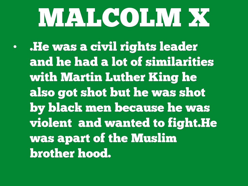 .He was a civil rights leader and he had a lot of similarities with Martin Luther King he also got shot but he was shot by black men because he was violent and wanted to fight.He was apart of the Muslim brother hood.
