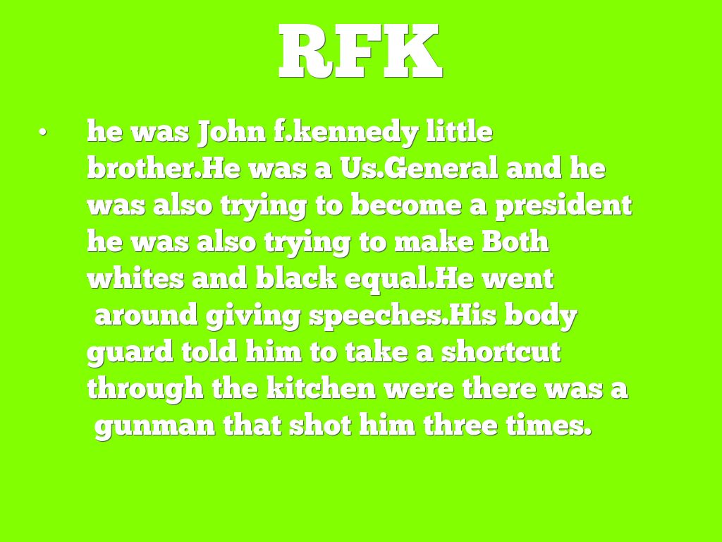 he was John f.kennedy little brother.He was a Us.General and he was also trying to become a president he was also trying to make Both whites and black equal.He went around giving speeches.His body guard told him to take a shortcut through the kitchen were there was a gunman that shot him three times.