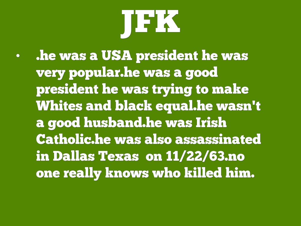 .he was a USA president he was very popular.he was a good president he was trying to make Whites and black equal.he wasn't a good husband.he was Irish Catholic.he was also assassinated in Dallas Texas on 11/22/63.no one really knows who killed him.
