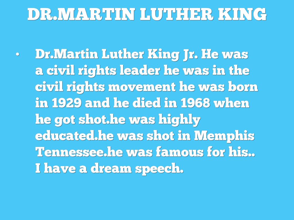 Dr.Martin Luther King Jr. He was a civil rights leader he was in the civil rights movement he was born in 1929 and he died in 1968 when he got shot.he was highly educated.he was shot in Memphis Tennessee.he was famous for his.. I have a dream speech.