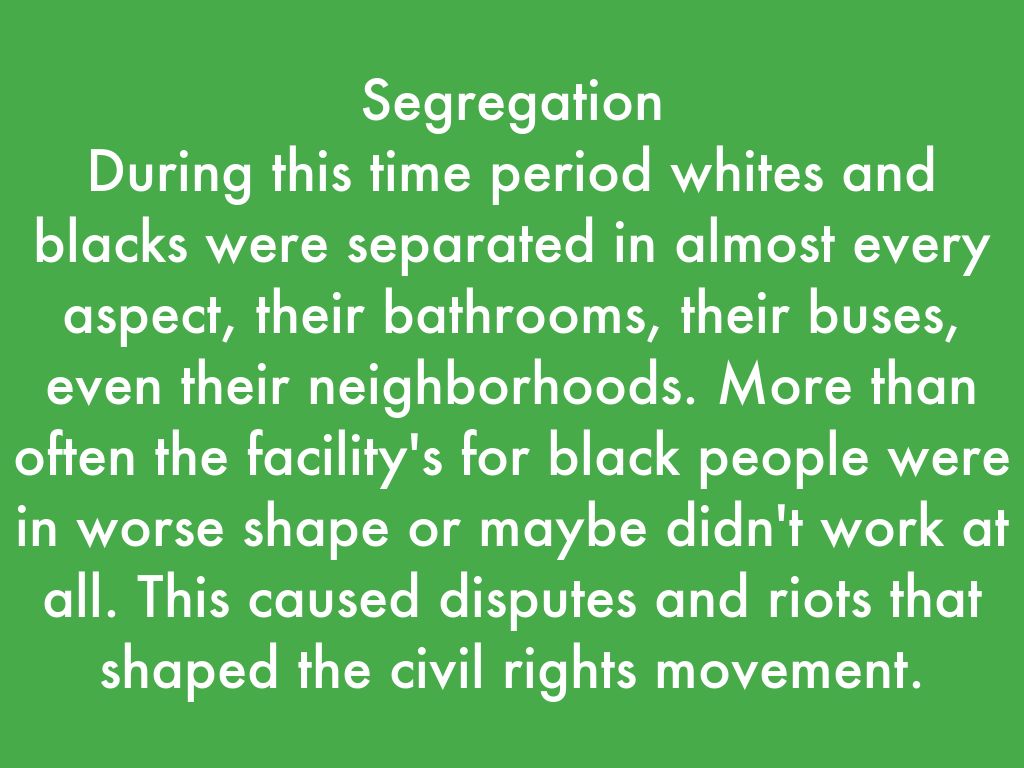 During this time period whites and blacks were separated in almost every aspect, their bathrooms, their buses, even their neighborhoods. More than often the facility's for black people were in worse shape or maybe didn't work at all. This caused disputes and riots that shaped the civil rights movement.