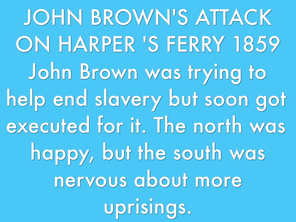 John Brown was trying to help end slavery but soon got executed for it. The north was happy, but the south was nervous about more uprisings.