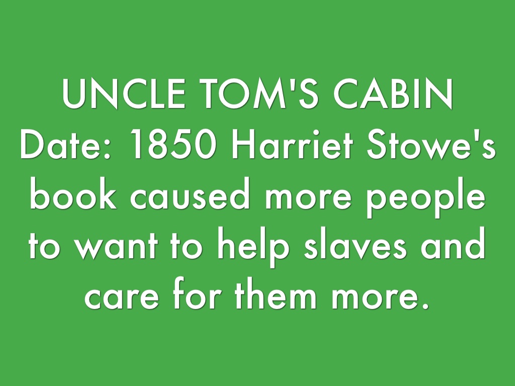 Date: 1850 Harriet Stowe's book caused more people to want to help slaves and care for them more.