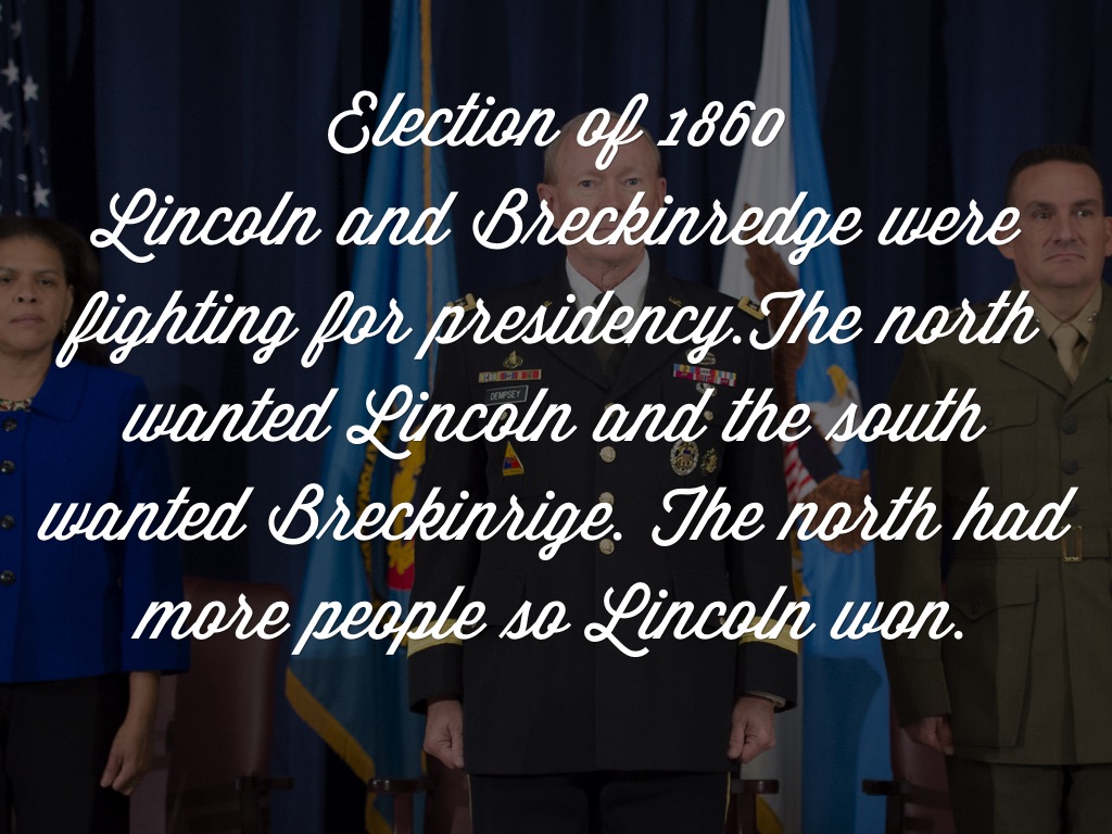 Election of 1860 Lincoln and Breckinredge were fighting for presidency.The north wanted Lincoln and the south wanted Breckinrige. The north had more people so Lincoln won.