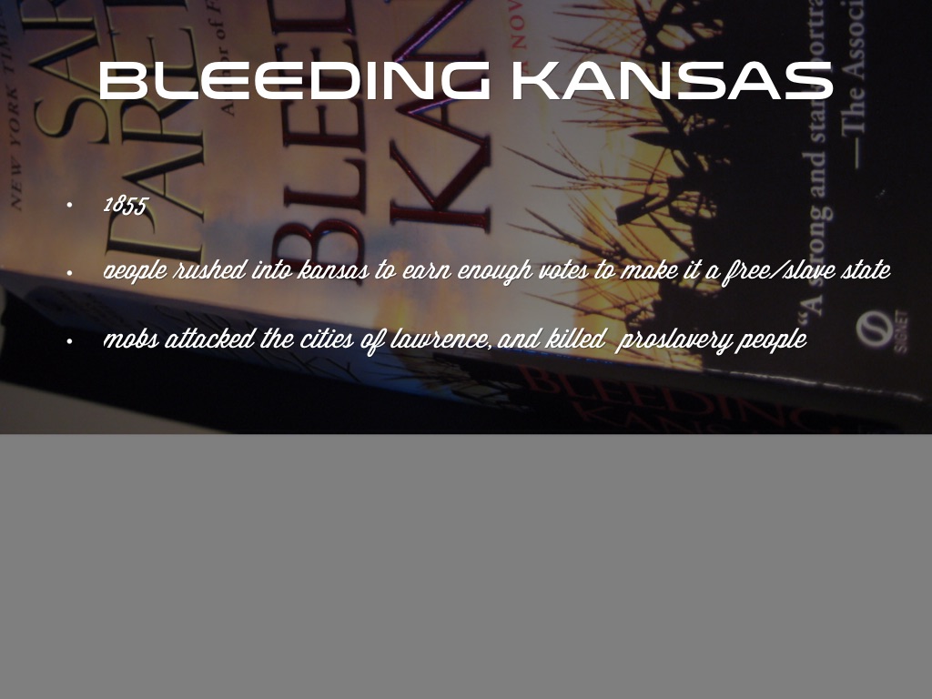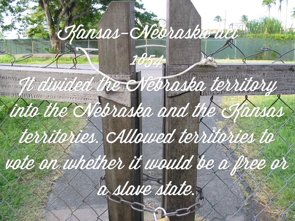Kansas-Nebraska act 1854 It divided the Nebraska territory into the Nebraska and the Kansas territories. Allowed territories to vote on whether it would be a free or a slave state.