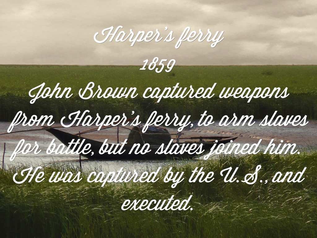 Harper's ferry 1859 John Brown captured weapons from Harper's ferry, to arm slaves for battle, but no slaves joined him. He was captured by the U.S., and executed.