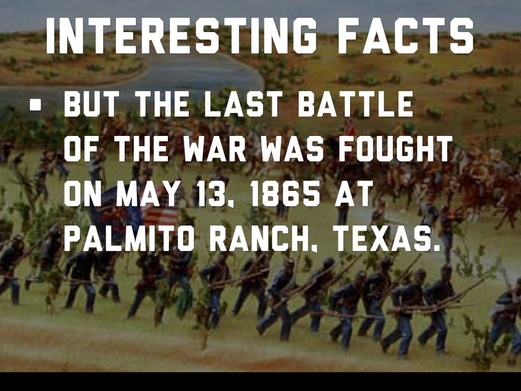 But the last battle of the war was fought on May 13, 1865 at palmito ranch, Texas.