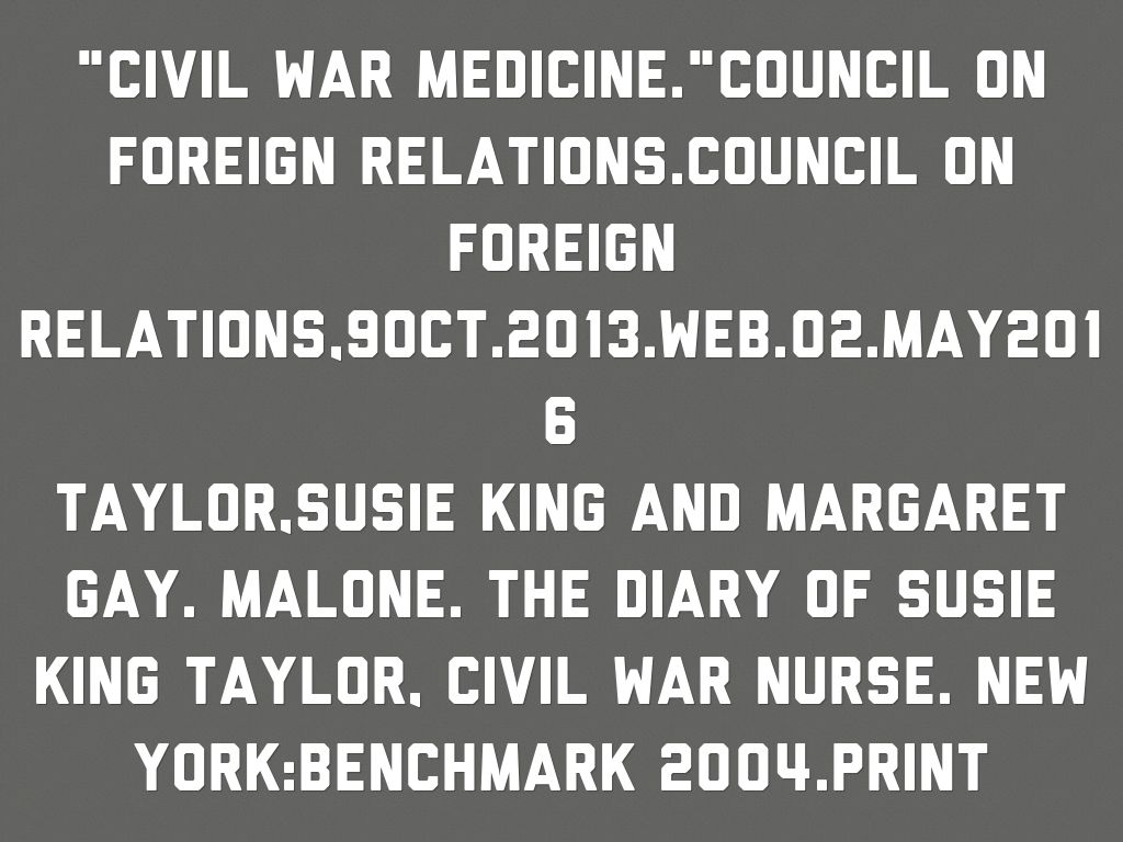 "Civil war medicine."council on foreign relations.council on foreign relations,9oct.2013.web.02.may2016 Taylor,Susie King and Margaret gay. Malone. The diary of Susie King Taylor, civil war nurse. New York:benchmark 2004.print