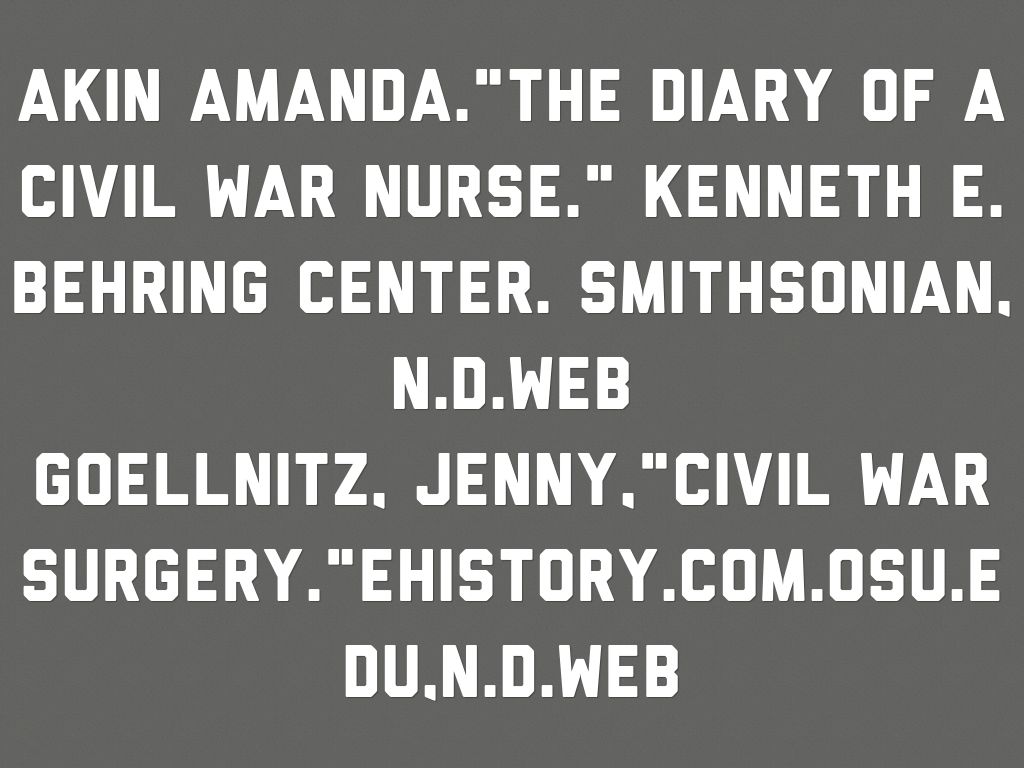Akin Amanda."the diary of a civil war nurse." Kenneth E. Behring center. Smithsonian, n.d.web Goellnitz, Jenny,"civil war surgery."ehistory.com.osu.edu,n.d.web