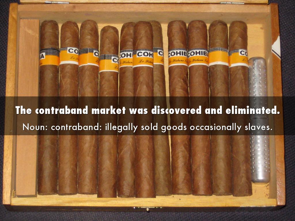 Noun: contraband: illegally sold goods occasionally slaves.